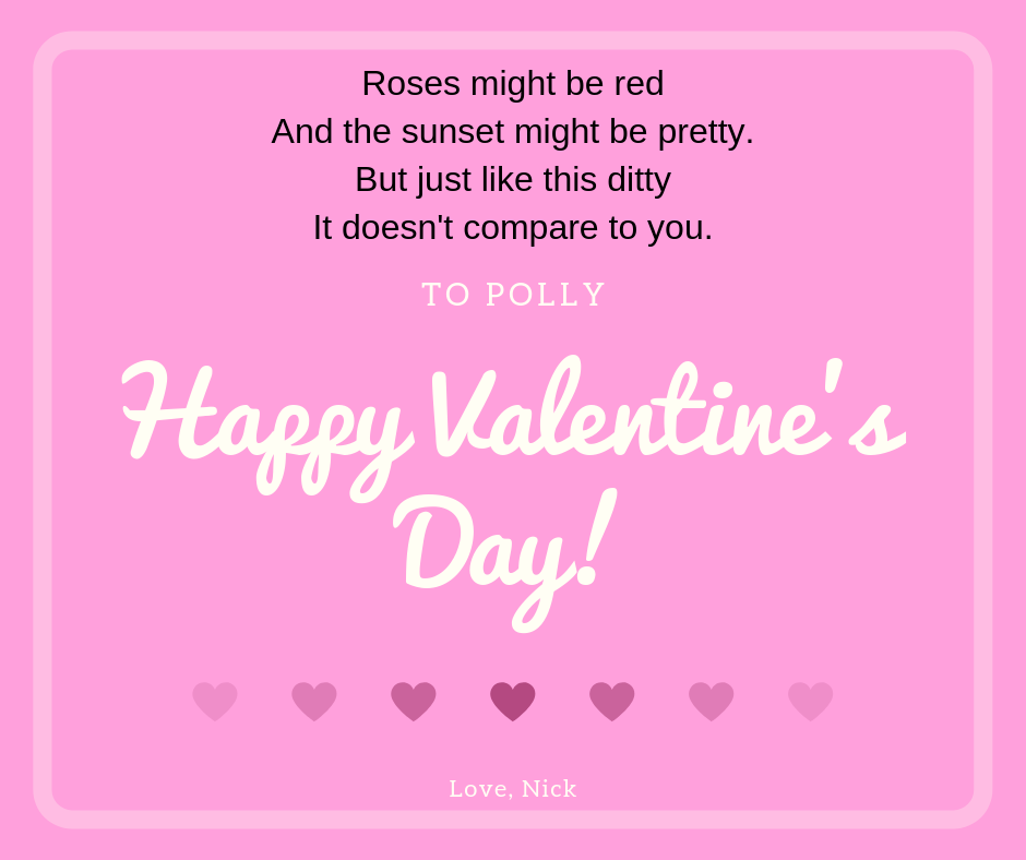 As you may have already seen on the Sweet Romance Speak page, Nick made a valentine for Polly and tried his hand at poetry. (Attached below for your giggling pleasure.) He’s also planning on sending her a signed book–Sweet Treats–which is a collection of three short Valentine’s Day stories. Would you like one, too?